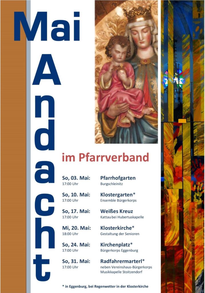 Herzliche Einladung zu den Maiandachten im Pfarrverband bei den wunderschönen Marienstatuen und Bildstöcken in unserer Gegend: immer sonntags um 17 Uhr.