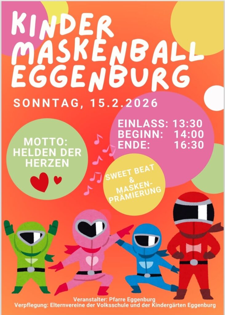 Unter dem Motto „Helden der Herzen“ findet am Sonntag, den 15. Februar von 14:00 bis 16:30 Uhr in der Stadthalle Eggenburg der Kindermaskenball statt. Einlass ist ab 13:30 Uhr.